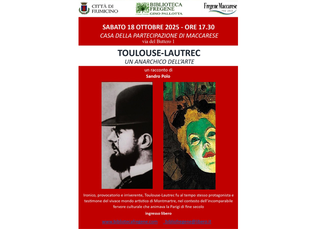 Sandro Polo racconterà TOULOUSE-LAUTREC – UN ANARCHICO DELL’ARTE, sabato 18 ottobre, alle ore 17,30, presso la CASA della PARTECIPAZIONE, in via del Buttero, a Maccarese.